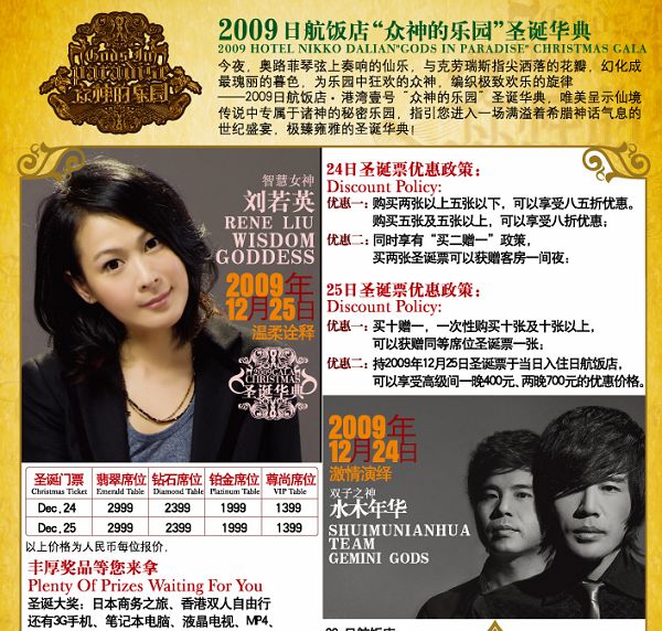 2009大連日航飯店圣誕節(jié)門票:尊尚席位1399元,鉑金席位1999元,鉆石席位2399元,翡翠席位2999元